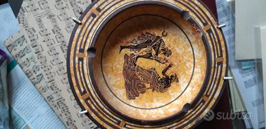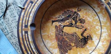 Piatto decorativo con un design ispirato all'arte greca antica. Presenta figure stilizzate su uno sfondo giallo ocra. Motivo con figure stile antico. Bordi decorati con motivi geometrici.