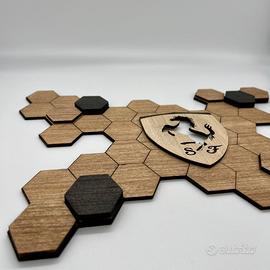 Decorazione artigianale da parete in legno dedicata alla Scuderia Ferrari di Formula 1, con effetto tridimensionale e dettagli ebanizzati Pezzo unico Misure 40x35cm Provvista di due fori nascosti sul retro per essere appesa