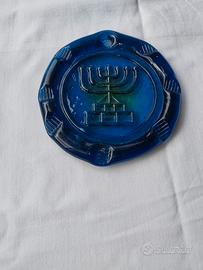 Vendo decorazione da finestra , detta anche acchiappa sole , in vetro di Murano colore blu, anni 50/60, raffigurante " Menorah " . La decorazione nel retro e in corrispondenza del foro di fissaggio ha una piccola sbeccatura come da foto . Dimensioni 11 cm. Spese a carico del destinatario