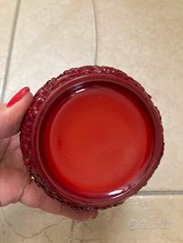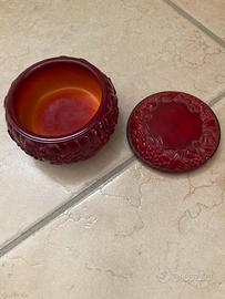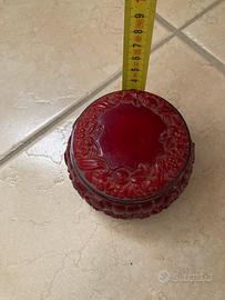 Scatola decorativa in vetro color rosso rubino utilizzata come portagioie o come decorazione Nel vetro ci sono fiirie frutti incisi Anni 60/70