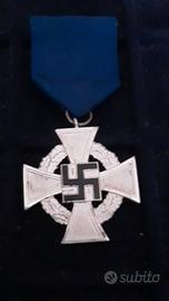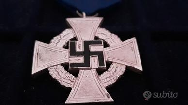 Bellissima "TREUDIENST-EHRENZEICHEN 2.STUFE" (DECORAZIONE PER 25 ANNI DI FEDELE SERVIZIO nell'amministrazione pubblica comprensiva della sua SCATOLA DI PRESENTAZIONE. Esemplare in ottimali condizioni della Decorazione nazista per Fedele Servizio (Treudienst Ehrenzeichen) da 25 anni in Germania. Questa decorazione fu istituita il 30 gennaio 1938 come premio per anzianità civile. Sia il secondo grado in argento, per 25 anni di servizio, sia il primo in oro per 40 anni, erano riservato agli impiegati del settore pubblico. Tutti i gradi erano appesi ad un nastro color fiordaliso. Le due decorazioni furono create dal Prof. Richard Klein di Monaco e consistevano in una croce "formosa" del diametro ufficiale di 42mm ( ma esistono alcuni esemplari da 40,5) con al centro la svastica e intorno una ghirlanda di foglie di quercia. La parte posteriore presenta la stessa struttura con la superficie picchiettata sulla quale poggia su tre linee la scritta "FUR-TREUE-DIENSTE"(Per fedele servizio). La decorazione per i 25 anni veniva consegnata in una custodia in finta pelle rossa, con la parte interna divisa in settori. Sul coperchio è goffrato il numero "25", circondato da un cerchio spinato color argento. Inoltre su questa scatola è presente un adesivo con la dicitura "FELDPOST" ovvero "POSTA MILITARE" all'interno della scatola vi è ancora il cartellino del produttore ovvero "FRANZ REISCHAUER " di Oberstein. La decorazione ha le seguenti dimensioni: 4cmX5cm, con il nastrino originale misura 9,5cmX4cm con attacco a spilla. La scatola 9,7cmX4,7cm e 1,1 cm di altezza.è in ottime condizioni solo nella parte sottostante il lato corto superiore è leggermente scollato ai lati.Tutto "rigorosamente" originale d'epoca al 100% e garantito! Spedizione: Raccomandata (9 euro); Metodi di Pagamento: Bonifico Bancario. Vaglia Postale, Paypal, altri sistemi di pagamento delle Poste. Diritto di Recesso entro 10 giorni. Ship worldwide.