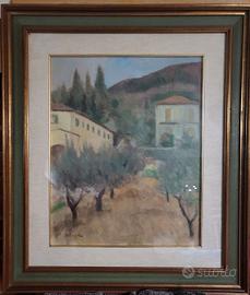 Diego Fanciullacci, è stato un pittore toscano noto per le sue vedute rurali e l'uso di pennellate morbide e materiche. Il dipinto raffigura uno scorcio di campagna toscana, tema centrale nella produzione dell'artista. In primo piano si nota un uliveto, reso con toni argentati e bruni, che guida l'occhio verso le architetture sullo sfondo. La scena è dominata da due edifici rurali (case coloniche) inseriti armoniosamente nel paesaggio collinare. La casa a sinistra è parzialmente nascosta dalla vegetazione, mentre quella a destra svetta con la sua facciata chiara e il tetto a spiovente rosso. La stesura del colore è ricca e pastosa, tipica del post-impressionismo toscano. Fanciullacci utilizza una tavolozza di colori naturali (verdi, ocra e azzurri tenui) per restituire l'atmosfera luminosa e serena della propria terra. Dimensione: 50x40 Cornice con vetro. Tecnica: olio su tela. Firma: in basso a sinistra.