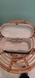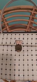 Borsa bauletto molto chic color bianco ghiaccio in struttura rigida con manico superiore realizzata in un materiale simile a paglia sottile intrecciata a griglia con piccoli motivi blu e pelle bianca sulla parte superiore, sulla base e sul manico. Chiusura metallica dorata centrale. Internamente rivestita in raso bianco con taschina laterale.Stile retro tipico degli accessori estivi eleganti del secolo scorso. Vari segni di usura normali in questi pezzi d'epoca.