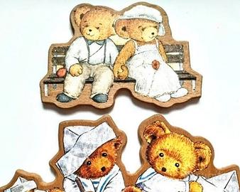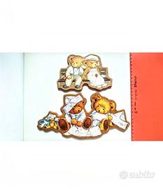 Deliziose decorazioni in legno raffiguranti orsetti, perfette per aggiungere un tocco di dolcezza a qualsiasi ambiente. - Set di decorazioni in legno. - Design con orsetti. - Ideali per decorare casa. - Misure cm 26 x 15 quella grande e centimetri 16x10 quello più piccolo