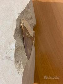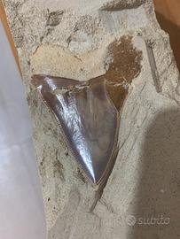 Dente megalodonte preistorico ancora incastonato nella pietra