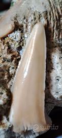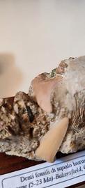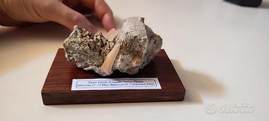 Coppia di Denti Fossili di squalo Isurus planus su matrice originale+BASE IN NOCE MASSELLO antico