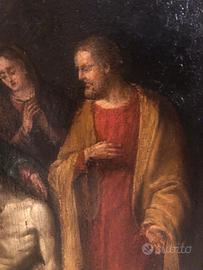 Dipinto olio su tavola, epoca XVI secolo (1500) opera di autore anonimo, rappresenta la deposizione del Cristo, in buone condizioni generali, nelle condizioni in cui è stato acquisito da collezionista privato, la cornice molto bella ancora del XVIII secolo, a completare il dipinto, le misure sono 50 x 40 cornice 64 x 54 x 4.5 Spedizione possibile. Non perditempo se possibile grazie.