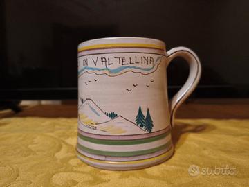 Esclusiva tazza in ceramica derutese dipinta a mano e firmata dall’artigiano Mariani (Deruta), realizzata in occasione dell’evento sportivo internazionale dei Campionati Mondiali di Sci Alpino 1985, ospitati nella splendida Alta Valtellina (Bormio e Santa Caterina).