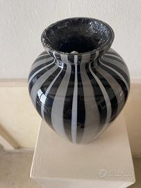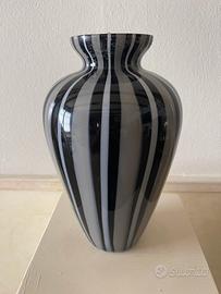 Elegante vaso di design in vetro di Murano incamiciato degli anni 1960-1970, già predisposto con foro per il filo da lampada. Il vetro, a doppia striscia nero-grigia esprime tutta l'arte dei maestri muranesi. Grazie