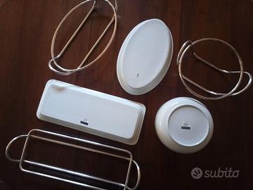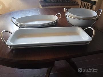 Pirofile ceramiche bianche da forno con supporto (forse placcato argento).
