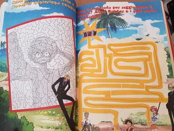 La copertina presenta una mappa stilizzata dei mari con il celebre simbolo della Jolly Roger di Luffy e illustrazioni vivaci dei personaggi iconici come Monkey D. Luffy con il suo cappello di paglia, Nami, Roronoa Zoro, Sanji e Usop nelle loro versioni classiche degli inizi della serie. Il design cattura perfettamente lo spirito d'avventura e l'energia della saga, con colori brillanti rosso e blu che richiamano il mare e il cielo. Il diario include pagine interne con spazi per annotazioni personali, informazioni scolastiche come nome, cognome, indirizzo, telefono, email, classe e scuola, oltre a sezioni dedicate a giochi e puzzle a tema One Piece.