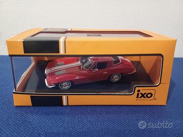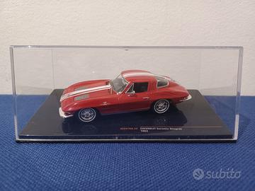 Automodello Ixo Models in metallo pressofuso e plastica, scala 1:43, riproducente la Chevrolet Corvette C2 Stingray modello 1963, di colore rosso con striscia trasversale bianca.