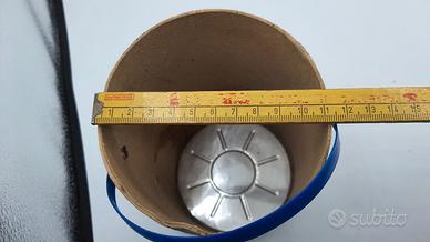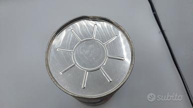 Il fondo metallico è lucido senza nessun focolaio di ruggine. Il cartoncino rigido presenta qualche segno dell'età. C'e' la maniglia in plastica rigida, ma manca il tappo.