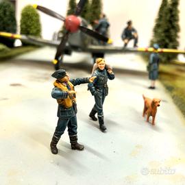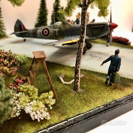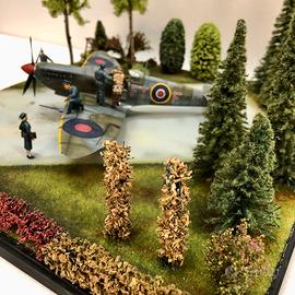 Ambientazione e Sfondo: La base del diorama ricrea un aerodromo operativo tra gli alberi, tipico delle basi della RAF per la dispersione e il camuffamento. La pista, probabilmente una superficie in erba o una sezione di pista temporanea in metallo (PSP), si fonde con un fitto ambiente boschivo. Gli alberi e la vegetazione, realizzati con materiali realistici, circondano l'area di decollo, fornendo un senso di urgenza e di operazioni condotte in relativa segretezza.