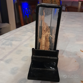 Diorama vintage, paesaggio con pagoda, cigni e piante, in sughero, custodito in vetro e legno.