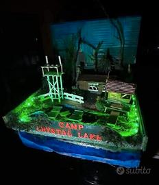 Diorama realizzato a mano artigianale con poliestere/ legno/ vernici acriliche / resine/ rami veri dotato di luci illuminazione ( Led verde) con pile applicate alla struttura.