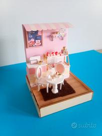 Miniatura di una pasticceria con dettagli curati e lucine a batteria. batterie incluse Misure 9x9x11cm - Tavolino rotondo bianco con sedie. - Espositori con dolcetti e bevande. - Decorazioni a tema. Codice D76