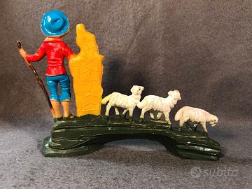 Diorama presepiale in polivinile con scritta al di sotto Italy, risalente agli anni 70/80. Raffigurante arco di Ponte in pietra con pastore appoggiato a un masso mentre e tre pecore in successione attraversano il ponte, ottima fattura ben definito, dipinto a mano come da foto. Misure cm. 18x14x4,5.