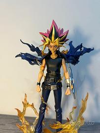 Figure di Yami Yugi in posa fiera con mantello dinamico ed effetti fiamma alla base. Dettagli curati sul Duel Disk e sul Puzzle del Millennio.