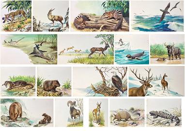 Vendo cartoni DIPINTI a mano degli anni '70 (NON STAMPE), raffiguranti mammiferi, anfibi, crostacei, uccelli, animali preistorici (come il brontoterio, l'orso delle caverne, il ranforinco, il cinognato, il brontosauro, il megaterio, il tetralofodonte, ecc.) di Gabriele Pozzi, autore e illustratore per riviste e libri naturalistici. Si tratta di dipinti eseguiti con inchiostro, matite colorate e acquerelli su cartoncino pesante, dipinti per una collana di libri dal titolo Piccola enciclopedia degli animali. Gli esempi in foto sono solo alcuni dei soggetti illustrati. Sono disponibile a inviare altre foto di altri soggetti su richiesta. Sono vere e proprie opere d'arte dettagliatissime. I cartoncini hanno due misure: 51x27 cm e 27x27 cm circa.