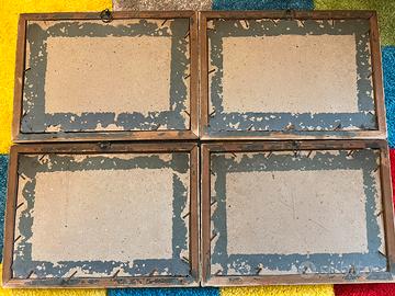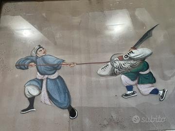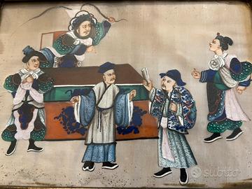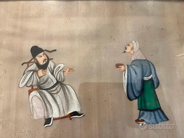 Un affascinante e decorativo set di quattro dipinti cinesi da esportazione su carta di midollo vegetale, ciascuno in una cornice individuale in legno dorato. Un classico esempio della produzione delle botteghe d'esportazione di Canton della dinastia Qing, creati specificamente per il mercato occidentale nel corso del XIX secolo. I QUATTRO DIPINTI: • Dipinto 1: Scena di gruppo con 5 figure in abiti riccamente ricamati blu, verdi e bianchi, riunite attorno a un tavolo • Dipinto 2: Due figure in piedi: uno studioso in abito bianco e un compagno in abiti blu e verdi, raffigurati con grande cura per i dettagli del viso • Dipinto 3: Due figure acrobatiche/di arti marziali in pose dinamiche, che impugnano bastoni e aste con estremità decorate • Dipinto 4: Due figure in energiche pose di combattimento/acrobatiche, una delle quali impugna una spada, rese con grande movimento e vitalità CARATTERISTICHE: • Tecnica: Guazzo su carta smaltata • Stile: Bottega di Canton per l'esportazione, coerente con la produzione per l'esportazione della dinastia Qing • Figure dipinte con grande cura per i dettagli, in particolare nelle espressioni del viso e nei motivi dei tessuti • Cornici: Quattro cornici in legno dorato abbinate, con segni di usura commisurati all'età DETTAGLI: • Provenienza: Canton (Guangzhou), Cina - prodotto per il mercato occidentale • Periodo: Dinastia Qing, metà-fine XIX secolo secolo • Condizioni: Da discrete a buone — un dipinto presenta una crepa/strappo nella carta di midollo; alcune macchie di umidità e scolorimento dovuti all'età su tutta la serie; le cornici dorate mostrano segni di usura e scrostature coerenti con l'età • Venduto come set completo di quattro PROVENIENZA: Ereditato in famiglia. Non sono disponibili certificato di autenticità o fattura d'acquisto originale. #setdecorativo #pitturagouache #artecinese #artesucartadimido #pittura #arte #arredamento
