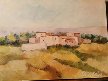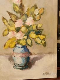 Tre dipinti ad olio 5ox7o di Enzo Cangi (1938-1974) Composizione,Paesaggio,Floreale.