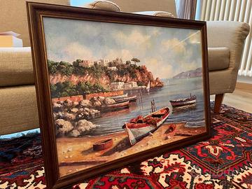 Dipinto fatto a mano da E. Roland. Immagine di una costa, con barche da pesca e paesino sullo sfondo. Incorniciato su quadro con cornice in vero legno. Tenuto in perfette condizioni