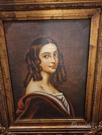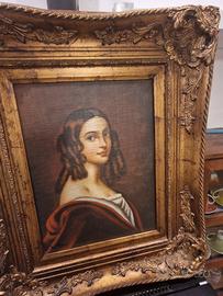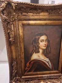 Elegante dipinto a olio su tela raffigurante un ritratto femminile incorniciato da una sontuosa cornice con finiture dorate ideale per salotto misure cornice 64x54 solo dipinto 39x29cm Autografato