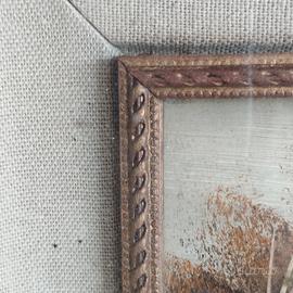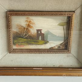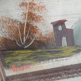 Vendo dipinto ad olio raffigurante una casa sul lago. Ha cornice esterna spessa in legno, vetro e all'interno c'è il passpartu' e un altra cornice in legno lavorato più piccola. La parte posteriore è da sistemare ma nel complesso è in buone condizioni. Misure : Cornice esterna cm 22 x 28 x 5