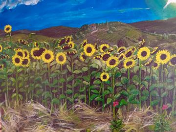 Sempre e pessempre, paesaggio con girasoli realizzato con pittura acrilica su tela, misure 50×60