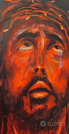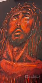 I toni predominanti del rosso e del nero creano un forte contrasto visivo, esprimendo con potenza il dolore, il sangue e la passione. Le pennellate decise e materiche donano profondità e movimento, mentre la luce che illumina il volto accentua l’intensità espressiva del soggetto.