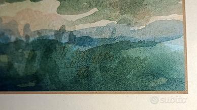 Dipinto ad acquerello originale incorniciato raffigurante un sentiero di un giardino in autunno, probabilmente ambientato in un giardino botanico o nel giardino di Monet a Giverny, in Francia. Firma di difficile lettura. Cornice in legno dorato con passepartout sotto vetro. Dimensioni cm 62 x h45 x 2,5.