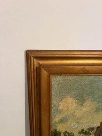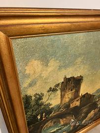 Propongo in vendita grande dipinto ad olio su tela di epoca tra fine XIX e primi XX secolo, raffigurante paesaggio italiano con torre in pietra, ponte e figure popolane.