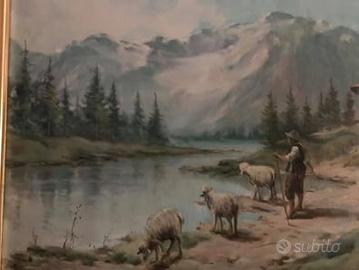 Splendido Dipinto anonimo primi del 900, olio su tela, raffigurante paesaggio montano con scena pastorale.