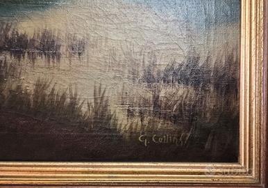 Paesaggio fluviale con gregge, XIX-XX secolo (più fine Ottocento), olio su tela, cm. 51X57,5, con cornice originale cm. 81X55, firmato in basso a destra entro cornice (craquelure e segni di battitura del telaio). Da considerarsi in ottimo stato considerando la sua "veneranda età". L'artista è George Collins, celebre pittore dell'epoca vittoriana/edoardiana e noto principalmente per i suoi paesaggi bucolici e pastorali tipici del Realismo Romantico. Consegna valida esclusivamente su Roma e provincia.