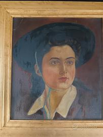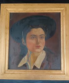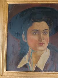 Dipinto originale firmato Bertoni e datato 1942, raffigurante un elegante ritratto femminile a mezzo busto. L’opera presenta uno stile tipico della ritrattistica italiana del primo Novecento, con colori caldi e una composizione armoniosa dominata dal grande cappello scuro. In buone condizioni generali, con segni del tempo visibili in foto. Completo di cornice in legno foglia oro. Dimensioni completo di cornice 57,5 x 53,5. Dimensioni senza cornice 44 x 40.