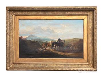 Olio su tela raffigurante una suggestiva scena pastorale di viaggio, con cavalieri e gregge in movimento lungo un sentiero collinare. La composizione, equilibrata e narrativa, si sviluppa in un ampio paesaggio luminoso, caratterizzato da dolci vallate e cieli atmosferici, tipici della migliore tradizione paesaggistica inglese dell’Ottocento.