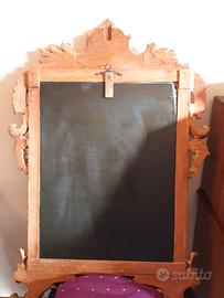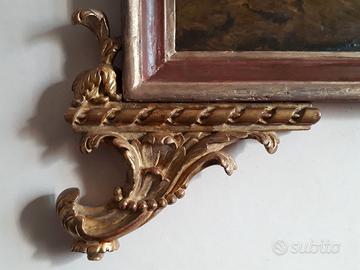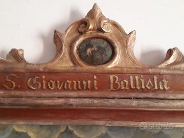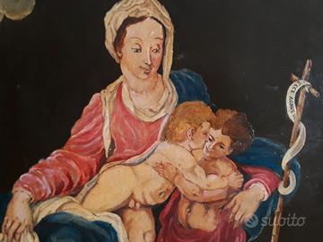 Importante dipinto raffigurante madonna con Bambino e San Giovannino. Il soggetto, di formato domestico, è dipinto ad olio su lastra unica di arenaria. La cornice di particolare bellezza, è ricca di elementi barocchi del sec. 1700 e la dedicazione in alto “San Giovanni”, corredata di stemma nobiliare, probabilmente della famiglia di provenienza dell’opera, in origine. La cornice, è in legno scolpito e fregi, coperta di foglia d’oro. Il quadro non necessita di alcun restauro. MISURE 48 x 64 (con cornice cm 77 x 110).