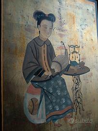 Stupendo dipinto su tavola, a fondo oro, raffigurante una donna nel rituale del tè. Dipinto di ottima qualità esecutiva, acquistato in Cina negli anni 1970, in negozio di antiquariato. È da considerarsi un oggetto da collezionismo, di fine 1800-inizio 1900.