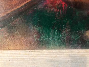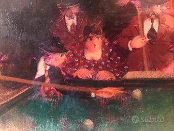 Dipinto olio su tela firmato in basso a sinistra ( Carlo Rosselli 1939 - 20..) opera in ottime condizioni generali, rappresenta dei personaggi impegnati in una “ partita di biliardo “ misure 25 x 40 cornice 67 x 51 x 5, in caso di spedizione il vetro verrà rimosso per non danneggiare l’opera.