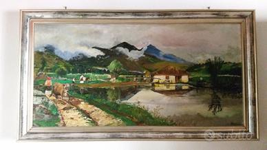 bellissimo quadro rappresentante la civiltà agraria contadina, bassa emiliana. H. 75 cm x 134 cm. Dipinto firmato Fabbri.
