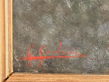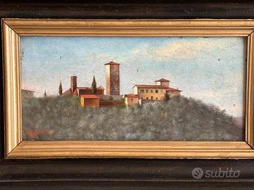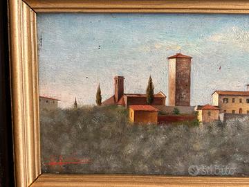 dipinto raffigurante paesaggio toscano, opera di Gioacchino Gamberini , olio su tavola , misure dipinto 17,5 x 8 .misure con cornice 27 x 17,5 . cornice coeva originale ebanizzata