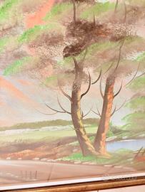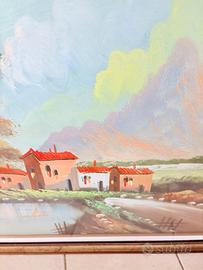 Vendo grande dipinto firmato dal maestro Sante, caratterizzato da uno stile materico e colori vividi. L’opera raffigura un luminoso paesaggio rurale con laghetto e montagne, incorniciato da un’importante e solida cornice in legno dorato con profilo bianco. Il quadro è in ottime condizioni conservative, ideale per impreziosire saloni classici o studi eleganti. Un pezzo d’arredo di grandi dimensioni pronto da appendere che dona profondità e prestigio a ogni ambiente.