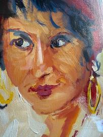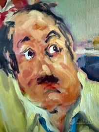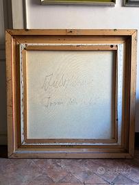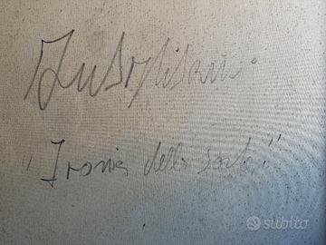 Importante dipinto originale del pittore folignate Giuliano Quagliarini (1941–2020). Opera di grandi dimensioni (100x100 cm, 126x126 cm con cornice), olio su tela, raffigurante scena figurativa d’interno con due personaggi. Il dipinto è firmato e riporta sul retro anche il titolo originale dell’opera: “Ironia della sorte”, elemento che ne aumenta l’interesse collezionistico. Attualmente protetto da vetro per maggiore conservazione. Pittura espressiva e materica, con colori vivaci e forte impatto visivo, tipica dello stile dell’artista. Buone condizioni generali. Dettagli: Autore: Giuliano Quagliarini Titolo: Ironia della sorte Tecnica: olio su tela Dimensioni dipinto: 100x100 cm Dimensioni con cornice: 126x126 cm Firma: presente (fronte e retro) Epoca: seconda metà ‘900
