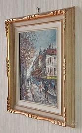 Dipinto a olio su tela impressionista d'epoca raffigurante una scena di strada parigina, probabilmente opera dell'artista Caroline Burnett, anni ’40 in vistosa cornice dorata decorata d’epoca con passepartout. Lo stile del dipinto cattura l'essenza della città, con un'enfasi sul colore e sulla luce rispetto ai dettagli. Ottimo stato. Dimensioni esterne cornice: cm 47 x h57 x 6.