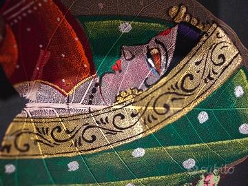 Dipinto tradizionale indiano su una foglia di Pipal (albero sacro Ficus religiosa (Pipal o Bo tree) usato come tela.