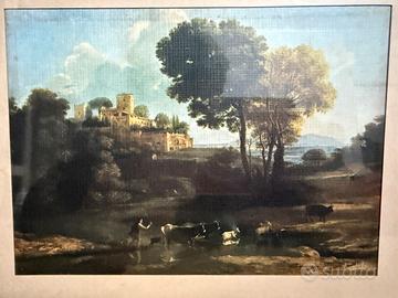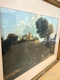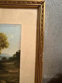 Caratteristiche dell'Opera Soggetto: Un paesaggio sereno con alberi in primo piano, uno specchio d'acqua (lago o fiume) e architetture classiche o castelli sullo sfondo. Stile: Caratterizzato da una luce calda, tipica del tramonto o dell'alba, e da una tecnica che fonde le pennellate per creare un'atmosfera soffusa. Cornice: Il dipinto è inserito in una cornice dorata con lavorazioni eleganti e un passepartout chiaro, tipico delle presentazioni per collezionismo o arredamento d'epoca