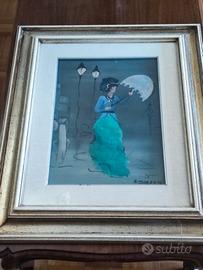 il quadro evoca un momento di quiete e riflessione in una serata ventosa, con un tocco di eleganza e mistero dato dalla figura femminile e dall’ambientazione urbana notturna.