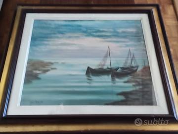 Quadro che ritrae un paesaggio marino al tramonto o all’alba, con due barche a vela ormeggiate vicino alla riva. L’atmosfera è calma e suggestiva, con un cielo nuvoloso dai toni delicati di blu e rosa che si riflette sull’acqua tranquilla. Un’opera che trasmette serenità e bellezza naturale, perfetta per chi ama i paesaggi marini.