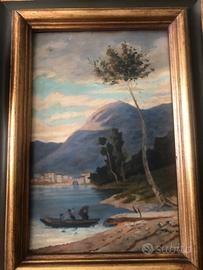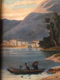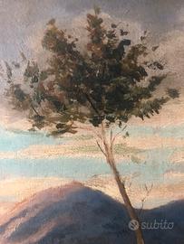 Elegante dipinto ad olio su tavola raffigurante un paesaggio della Liguria, con un piccolo villaggio costiero, una barca con figure in primo piano e un albero slanciato che incornicia la scena. Sullo sfondo, dolci rilievi montuosi e un cielo mosso da nuvole e velature creano un’atmosfera di profonda quiete e lirismo.